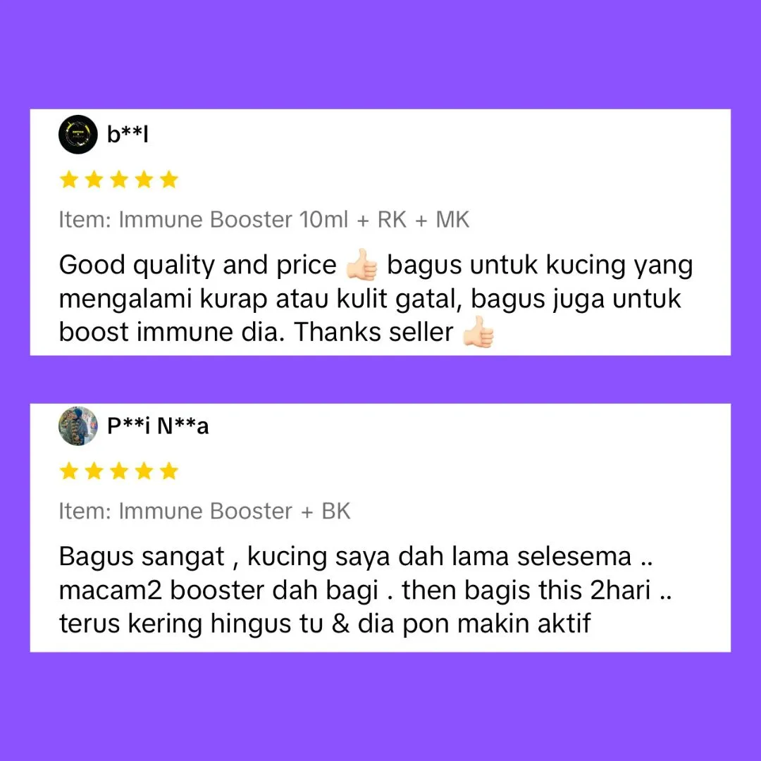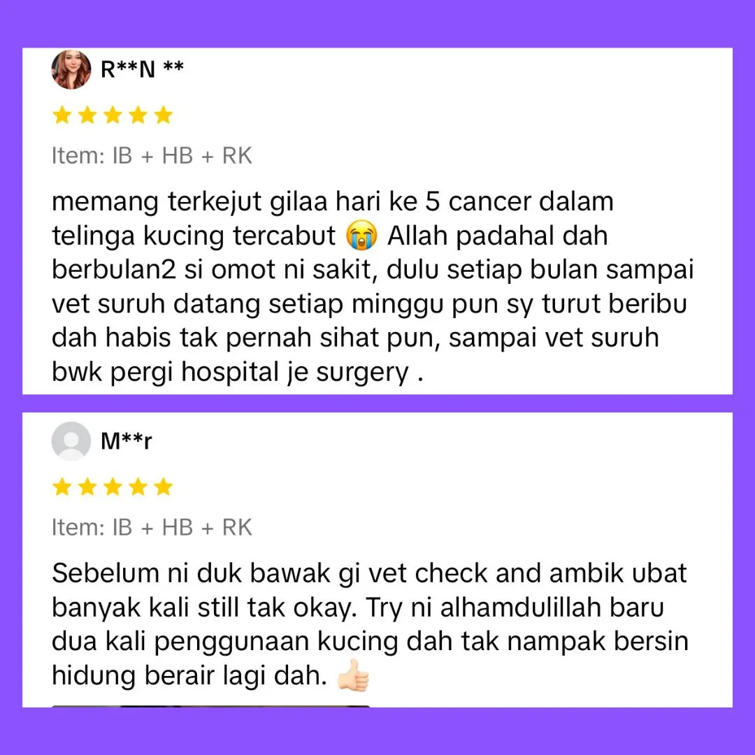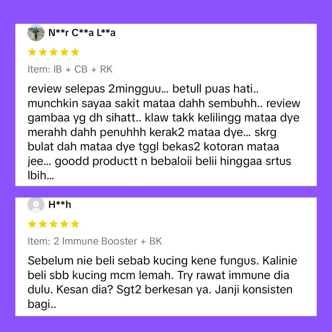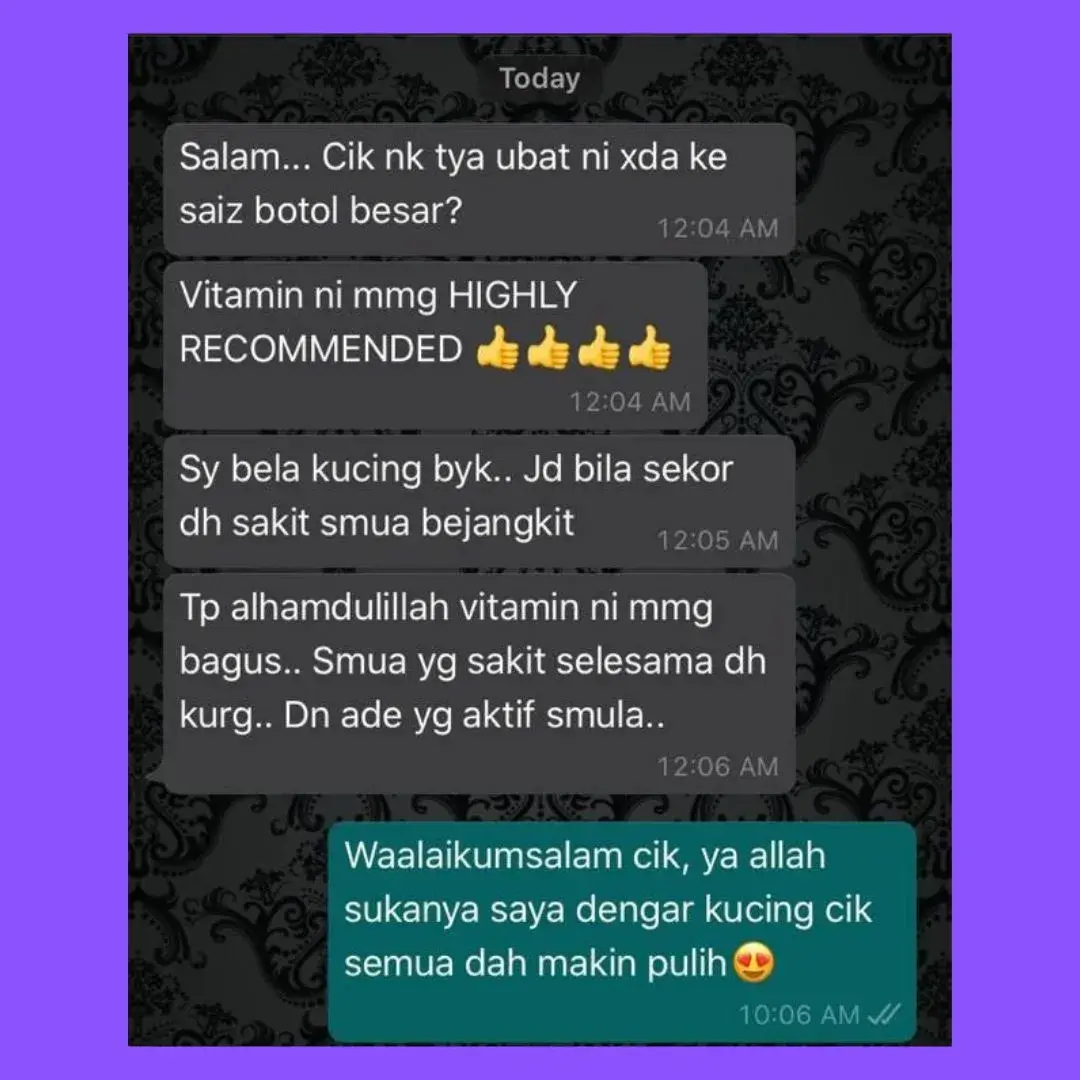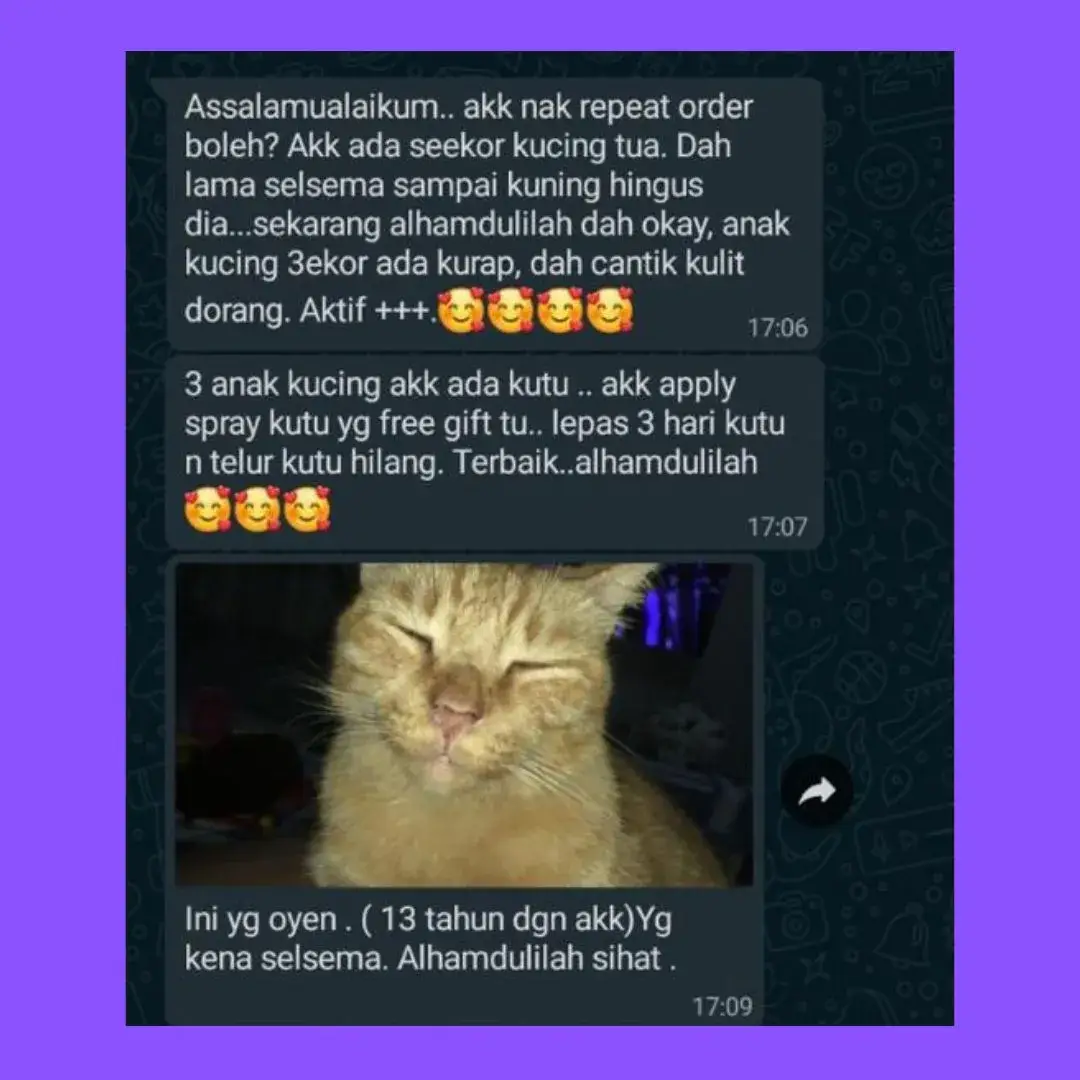 “Bulu kucing saya sebelum ini banyak gugur dan kurang aktif. Lepas guna Omega Plus beberapa hari, bulu nampak lebih sihat dan kucing jadi lebih bertenaga.”